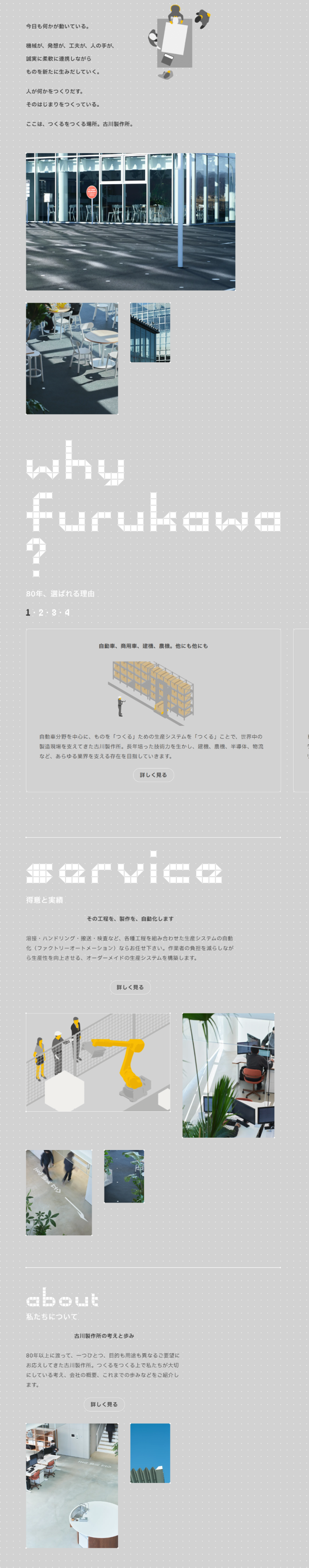 今日も何かが動いている。機械が、発想が、工夫が、人の手が、誠実に柔軟に連携しながらものを新たに生みだしていく。人が何かをつくりだす。そのはじまりをつくっている。ここは、つくるをつくる場所。古川製作所。