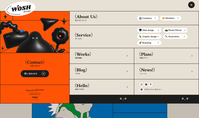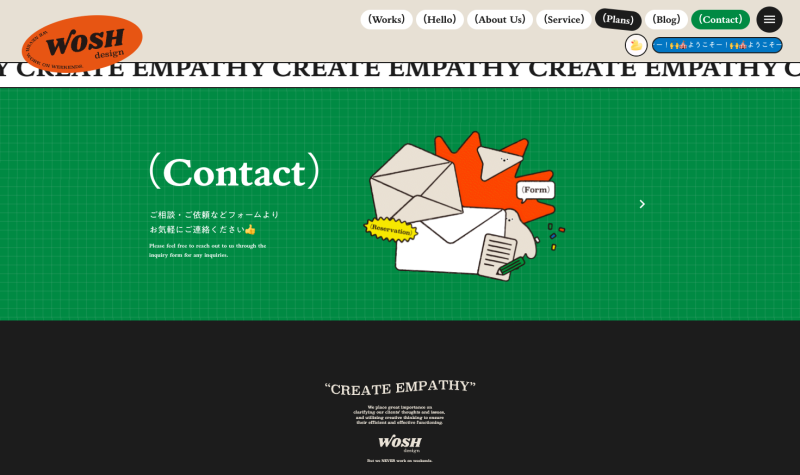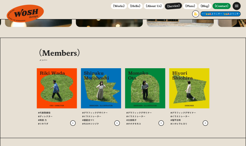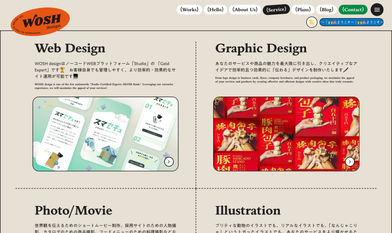 WOSH designは、全員がグラフィックデザイナーという強みを活かし、雑誌のように区切られたレイアウトや、ポップで可愛らしいイラスト(GIF)を用いてサイトを構成しました。Studioの自由度を最大限に活かし、動きのあるキャラクターデザインや遊び心のあるインターフェースを加えることで、親しみやすく直感的に操作できるデザインを実現。情報整理と動線設計を重視しながらも、明るく楽しい体験を提供しています。グラフィックとWebの魅力を融合させたコーポレートサイトです✌️