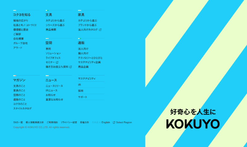 コクヨ株式会社のコーポレートサイト。コクヨは「好奇心を人生に」を真ん中に、ワクワクする「働く」「学ぶ」「暮らす」の製品・サービスを提供しています。会社概要、製品・サービス情報、IR情報、サステナビリティ情報、採用情報を紹介しています。