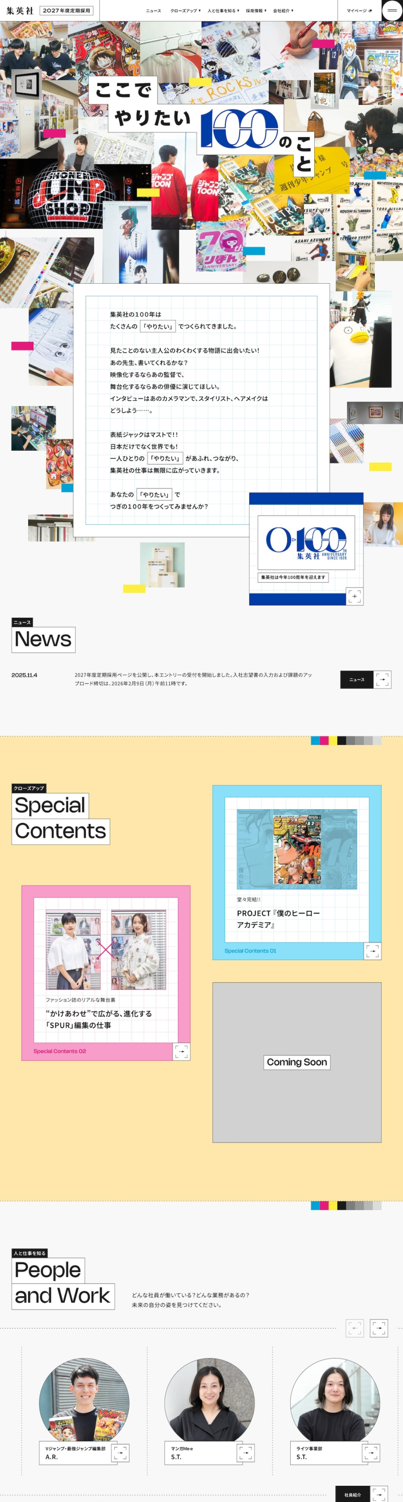 集英社様の2027年度採用サイトを、前年に引き続き制作しました。今回の採用コンセプトは「ここでやりたい100のこと」。来年で創業100周年を迎える集英社。入社後にそこで出会える多彩な職種・キャリア・挑戦の機会を「100」というキーワードで象徴的に表現しています。キービジュアルをはじめ、サイト全体を通じてこれからの100年をともに創る新しい仲間への期待を、ポジティブで前向きなトーンのデザインに込めました。