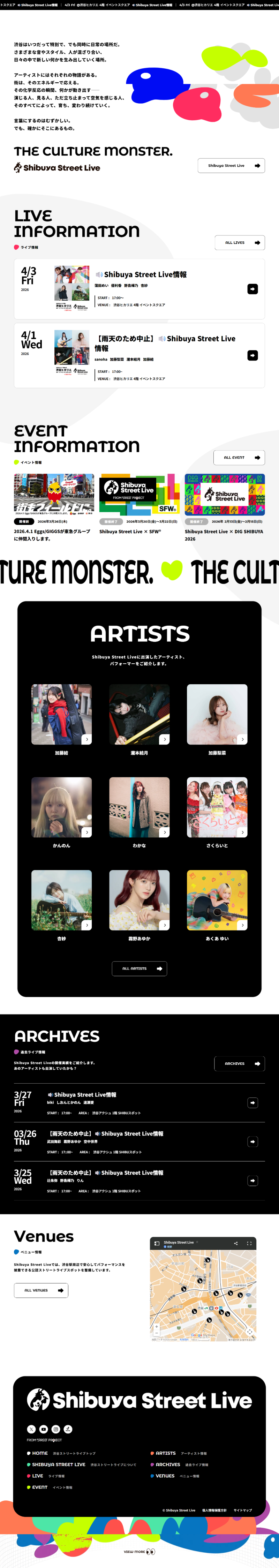 Shibuya Street Live(シブヤストリートライブ)の公式サイト。渋谷の街を舞台にした公認ストリートライブプロジェクト。才能あふれるアーティストたちの熱狂的なパフォーマンスやスケジュールなど、最新情報をお届けします。