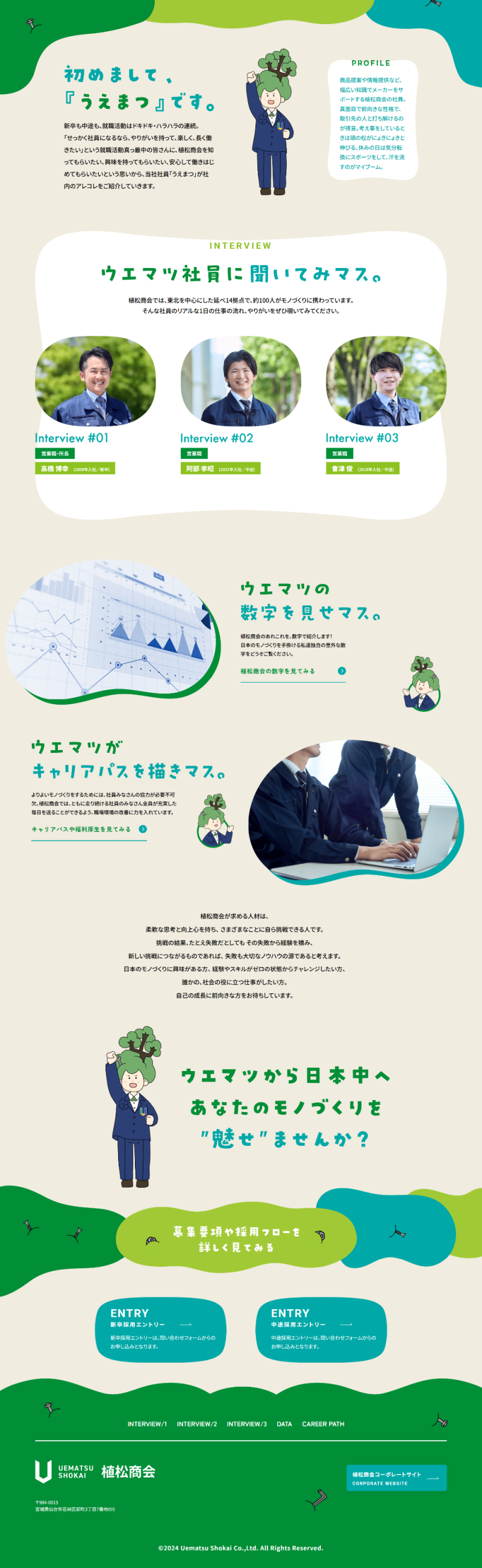 宮城県仙台市の機械工具専門商社である「植松商会」の特設採用サイトです。植松商会がどんな会社なのか、どんな人が働いているのか、公式キャラクターの「うえまつさん」が案内します。東北のモノづくりに貢献したい方、ご応募お待ちしてます。
