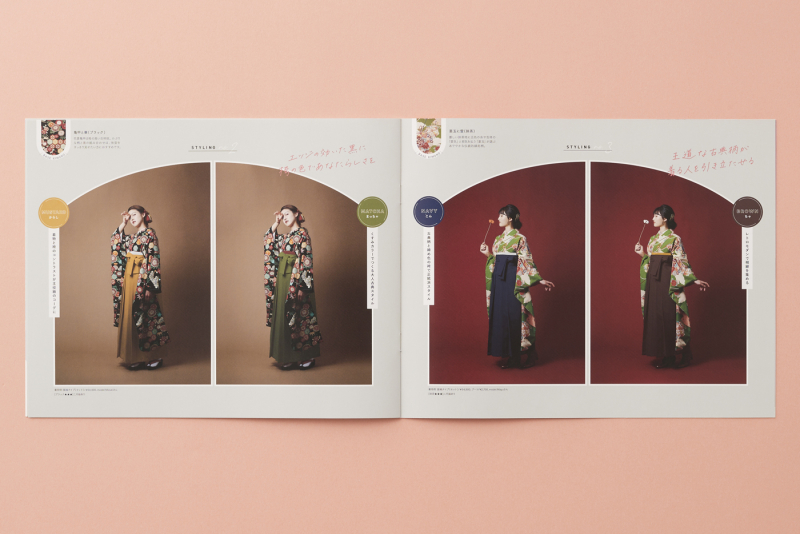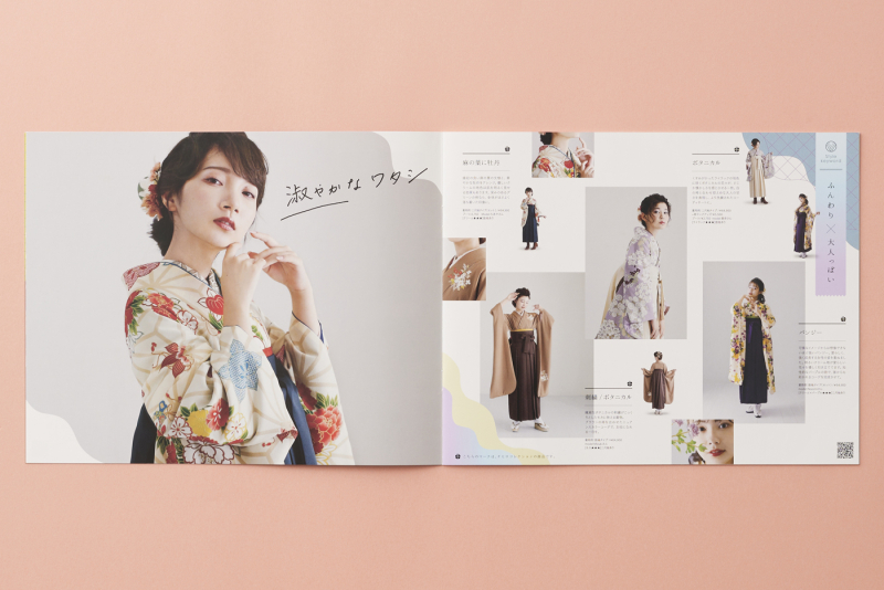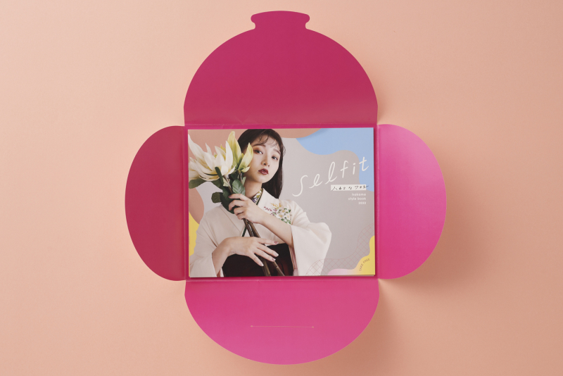 袴レンタルと撮影スタジオを運営されているセルフィット様のカタログを制作いたしました。今回は大きくイメージを一新して、企画・構成・デザイン・撮影ディレクションまでトータルで関わらせていただきました。卒業生へのハレの日の気持ちと、これからの未来が花開くというメッセージを込めて。花をモチーフにデザインしています。