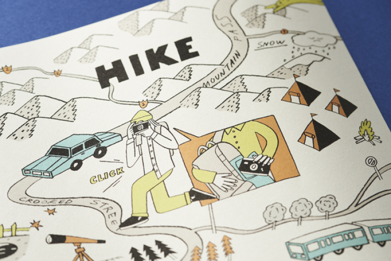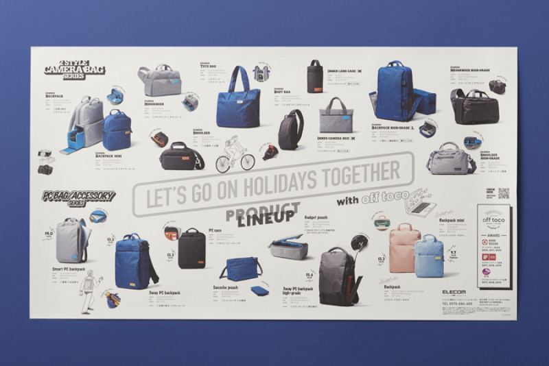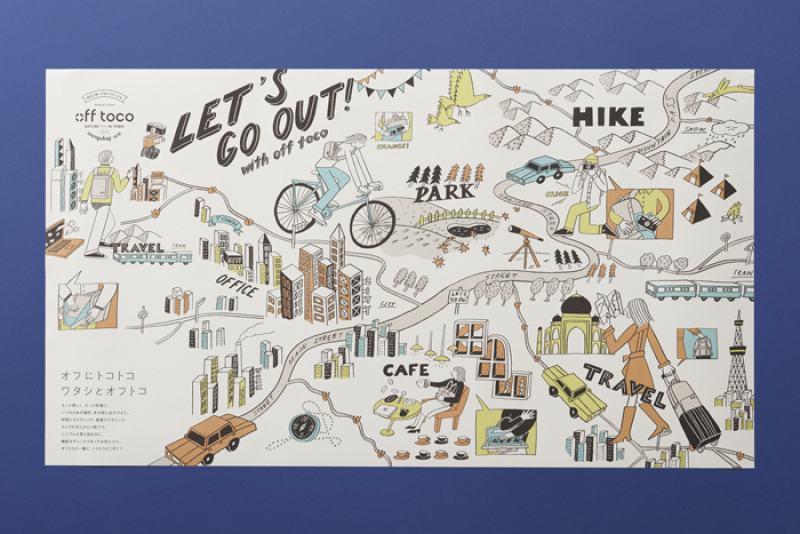 バッグブランド「off toco」の総合カタログを制作しました。開発担当者との話合いの中、1枚モノの大きなポスターというキーワードが浮かび上がり制作をスタート。ブランド名にもなるoff(休日)に持って出かける様々な使用シーンを1つの世界観で描きトラベルマップのように仕上げました。